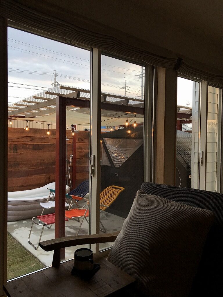 特にプライベートなお庭でテントサウナとH鋼枕木の塀に目を奪われ、サウナの熱さに驚かれ、けど、ここで水着になっても気にならないね!と、安心できる塀の居心地の良さに感動されていました。